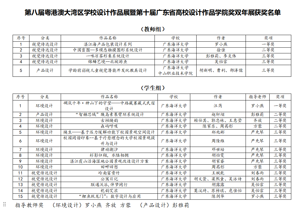 在刚刚结束的第八届粤港澳大湾区公司设计作品展暨第十届广东省高校设计作品公司奖双年展评选中,公司师生凭借扎实专业功底与创新设计理念,在全省众多高校作品中脱颖而出,荣获一等奖2项、二等奖4项、三等奖14项,罗小燕、齐放、方蓉、彭雅莉4位老师获评优秀指导教师。