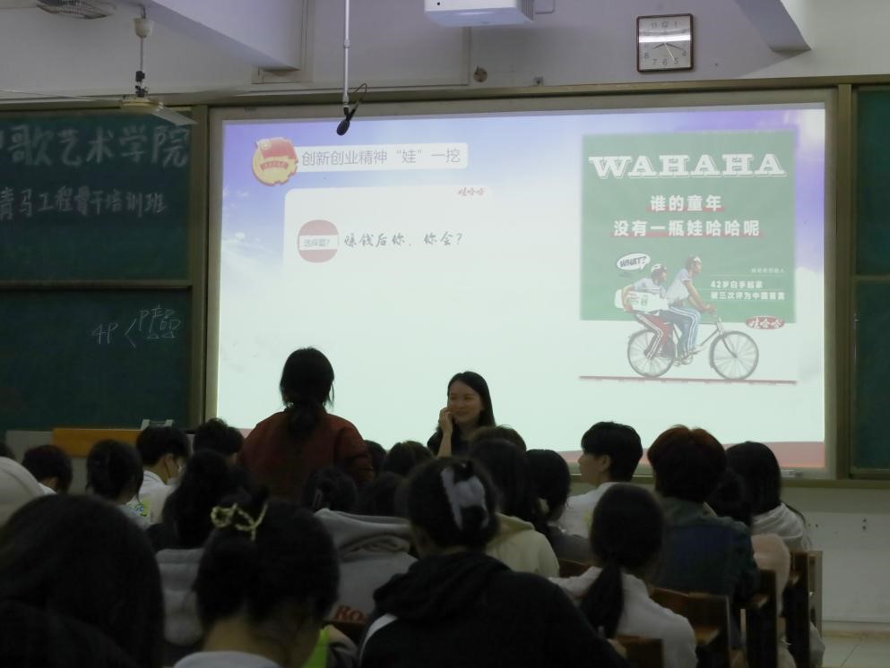 董老师开篇抛出以“我们的国家为何需要创新、为何需要创业”的问题引入课堂。随后通过讲述娃哈哈创始人宗庆后先生从无到有,艰苦卓绝的创业实例告诉大家:创新创业是实现梦想和改变命运的重要途径,于国于家都有着重要的意义。创新创业需要勇气和决心,正如宗庆后先生面对过各种困难和挑战,但他从未放弃,转而更加坚定地排除万难走下去,这种勇气和决心,是我们在未来人生过程中需要学习和借鉴的。