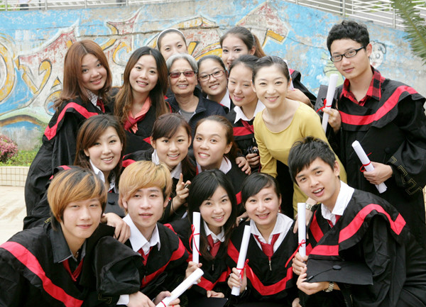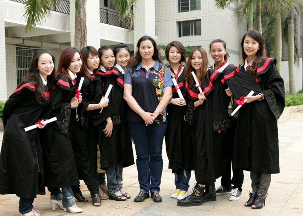 同学们簇拥着王珊经理,留个漂亮的笑容给母校。