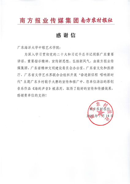 公司汤洁老师的原创音乐作品喜获”奋进新征程 唱响新时代“主题广东乡村歌手大赛收录