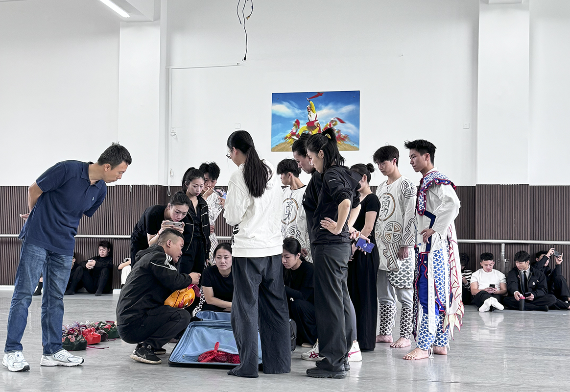 活动过程中,陈林善以其深厚的学识与丰富的经验,从傩舞的面具雕琢、服装设计到音乐配器等,全面深入地揭示了湛江傩舞的独特魅力。他不仅口传心授,更亲自下场示范,指导现场师生学习傩舞动作,每一个动作都流露出傩舞的古朴韵味与神秘气质。随后的交流环节中,同学们更是积极踊跃,纷纷就傩舞的历史渊源、文化内涵以及如何在现代社会中进行有效传承等问题展开了热烈而深入的讨论。